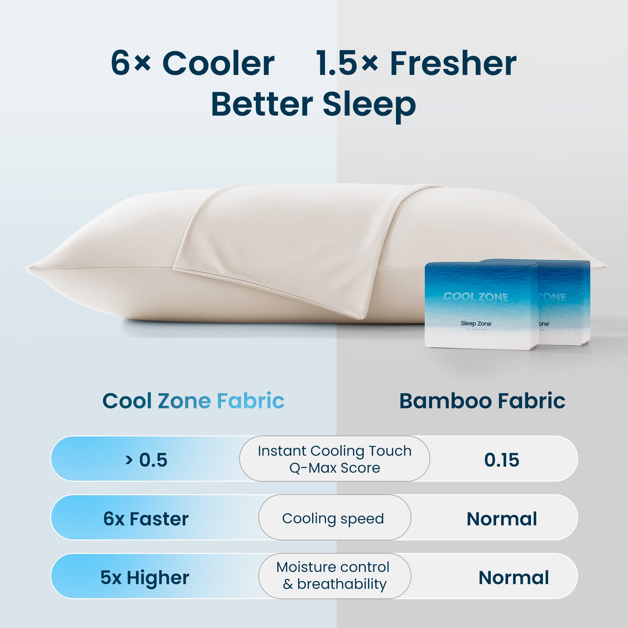 These advanced cooling pillowcases are crafted from double-sided fibers with a Q-MAX rating of 0.5 that actively absorb and dissipate body heat, ensuring a refreshing sleep. Featuring Nanotex® technology, they wick away moisture, while a 10% spandex blend combats static to keep hair smooth and promote skin health. The luxurious jersey knit on both sides provides a cloud-like softness, making these pillowcases the secret to a cool, comfortable, and restful night.