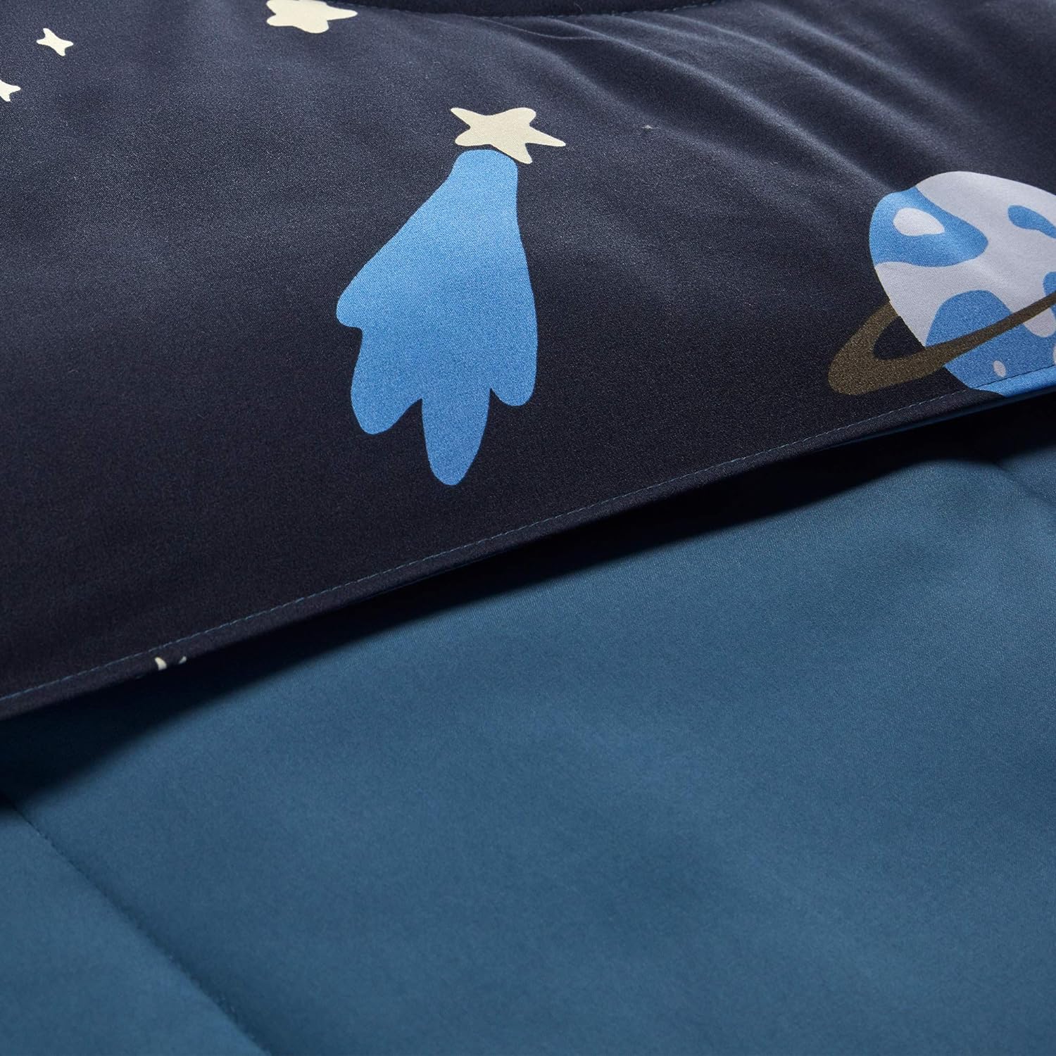 - CUTE DESIGN FOR KIDS - We used a dark starry background, plus stars, moons, planets, and meteors to design this bedding. Now, let your child start exploring the mysterious universe every day in his sleep. It is very cute and charming, He will fall in love with this bedding at a glance. Matching the blue on the back, it is a quiet color, Your child will sleep and wake up with a sweet smile.