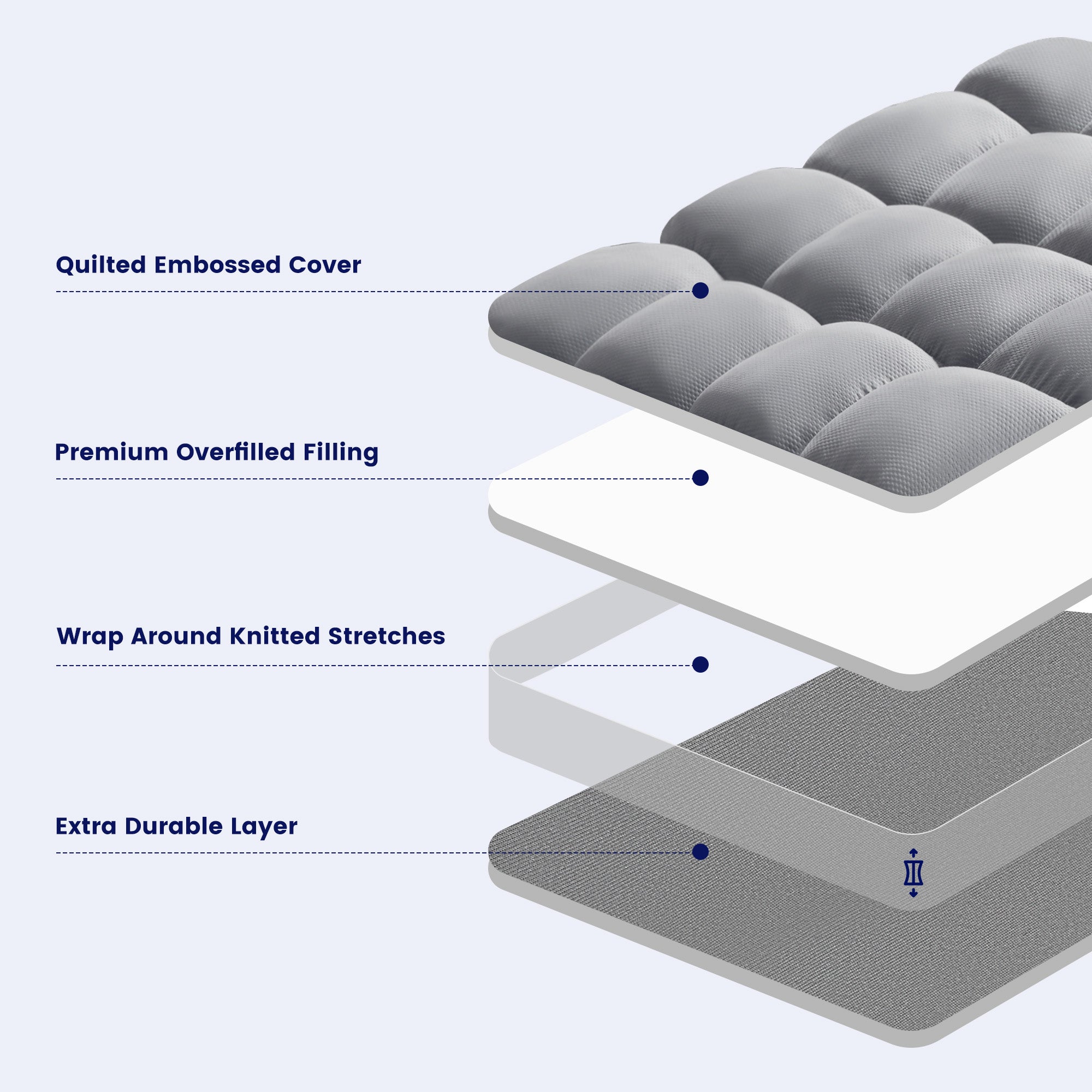 We utilize 120gsm thick brushed ultra-fine fibers as the sleep surface, providing a cool and breathable feel. Filled with 850gsm 5D spiral fibers, thicker than most on the market, the fiber filling maintains exceptional softness and elasticity, making this mattress topper exceptionally fluffy. It creates an extraordinary sleep environment that will enhance the quality of your sleep.