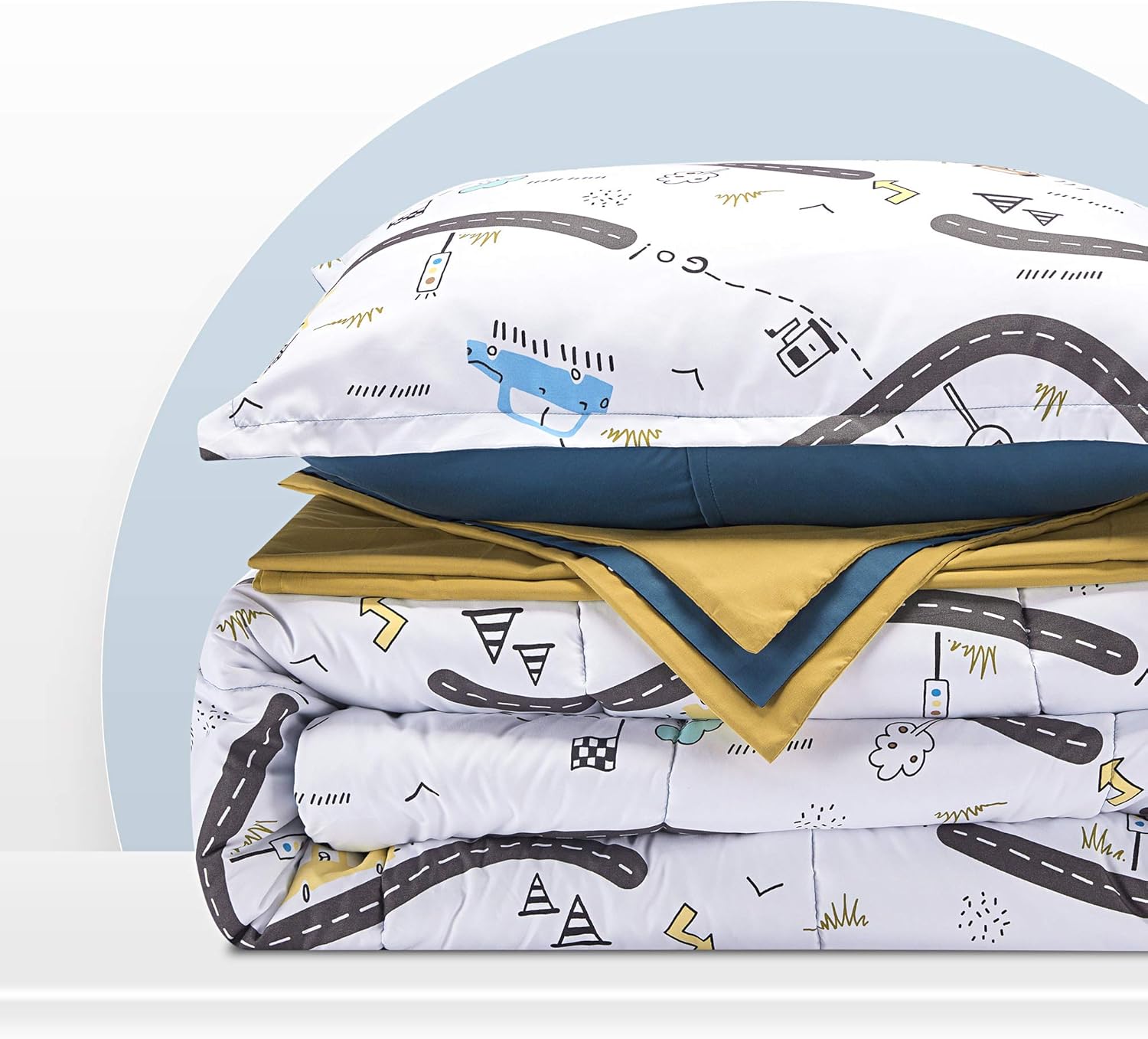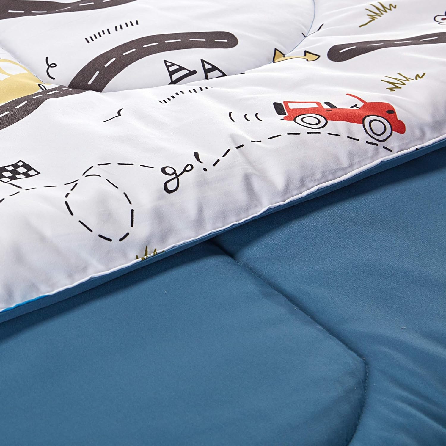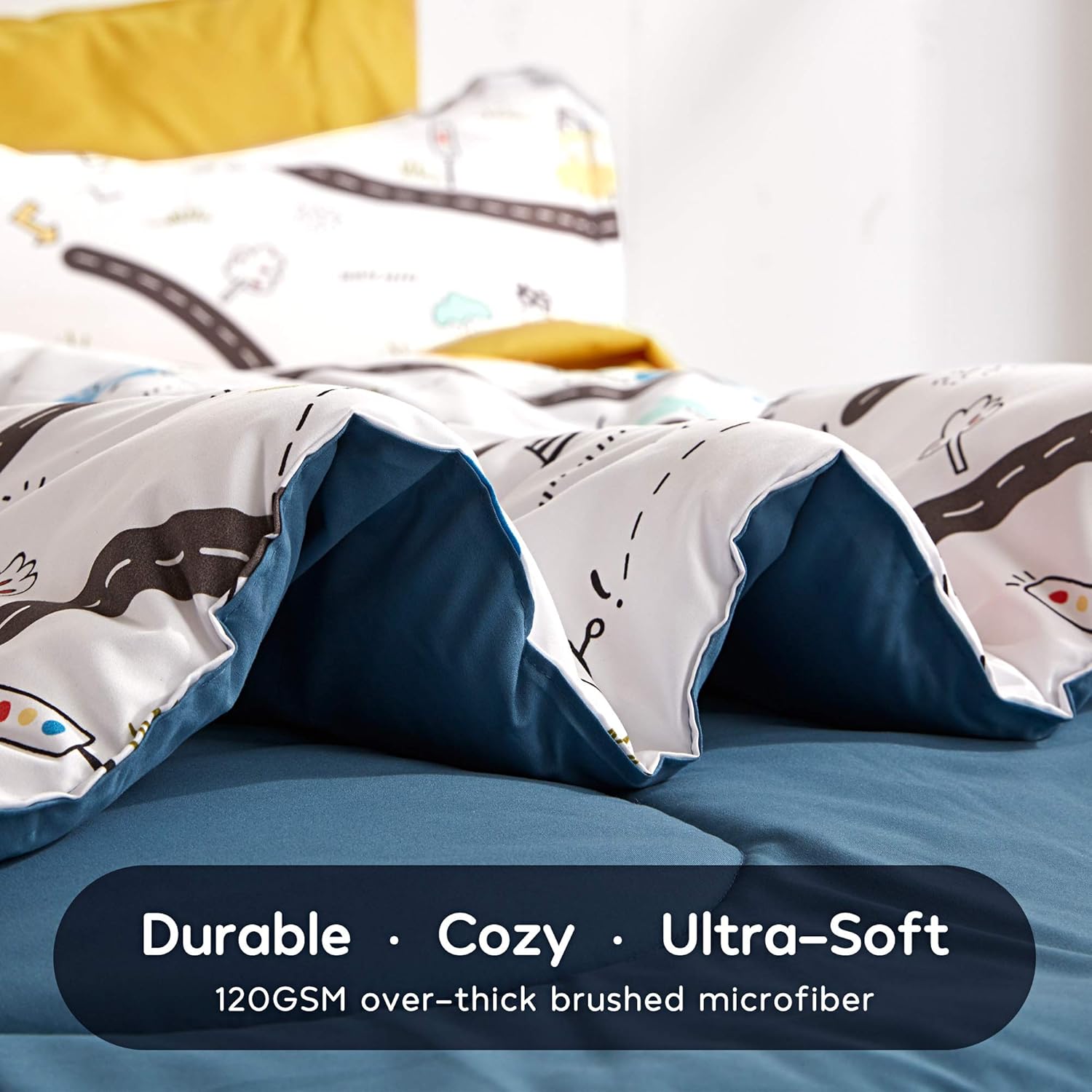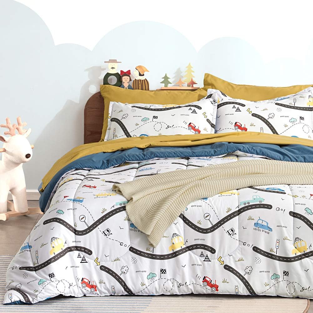 - CUTE DESIGN FOR KIDS -We used a variety of elements to design this super cute kids' bedding set. Combining roads, cars, grass, trees, birds, and more to create a diverse and childlike world. The color on the back is the pure white. This design creates a warm, sunny, and hopeful world, which is consistent with your care for children. Your child will sleep and wake up with a sweet smile